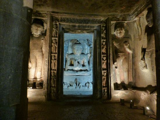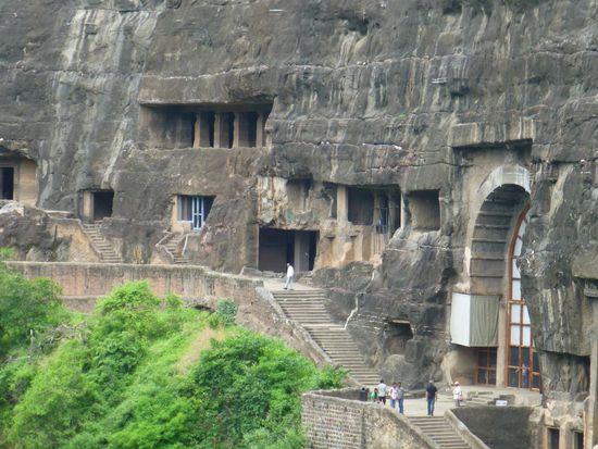 Wir chartern wir ein Taxi, das uns ins 120 km entfernte Ajanta bringt. Die Felsenhöhlen von Ajanta wurden in die fast senkrechten Hänge einer hufeisenförmigen Schlucht gemeißelt. Es war für die umherziehenden Mönche eine ideale Möglichkeit, um eines der ersten Klöster in aller Abgeschiedenheit zu gründen und Ruhe und Frieden für die Meditation zu haben. Die ersten kamen bereits im 2. Jhdt. Vor Christus (!!!) hierher. In der Hochzeit lebten hier über 200 Mönche zusammen mit Arbeitern, Bildhauern und Malern. Alle Höhlen wurden aus dem vollen Fels herausgemeißelt, alle Skulpturen, alle Säulen, alle teilweise riesigen Buddhas, alle Details sind komplett aus dem Vollen gearbeitet. Eigentlich natürlich ganz einfach, denn man muss ja nur das weghauen, was da nicht hingehört.