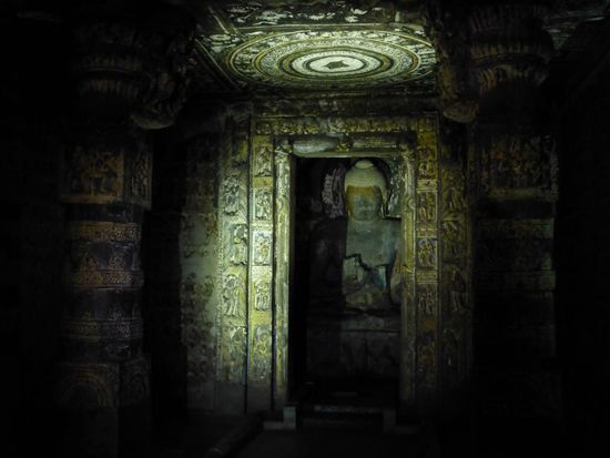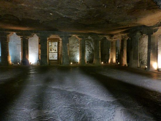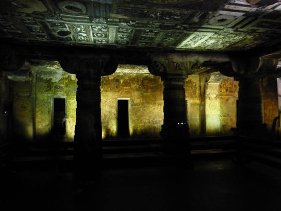 Eine unvorstellbare Arbeit, wenn man die riesigen Hallen oder Höhlen sieht, die bis zu 20m in den Fels getrieben wurden und Höhen von geschätzt 14m aufweisen. Es gibt 30 Höhlen, die aber im 7. Jhdt. aus unbekannten Gründen verlassen wurden. Sie wurden dann vergessen, wucherten zu und wurden daher von den muslimischen Bilderstürmern (erfreulicherweise) übersehen. Erst 1819 machte ein britischer Soldatentrupp einen der sensationellsten archäologischen Funde aller Zeiten (vgl. Macchu Pichu), die Höhlen sind daher außergewöhnlich gut erhalten.