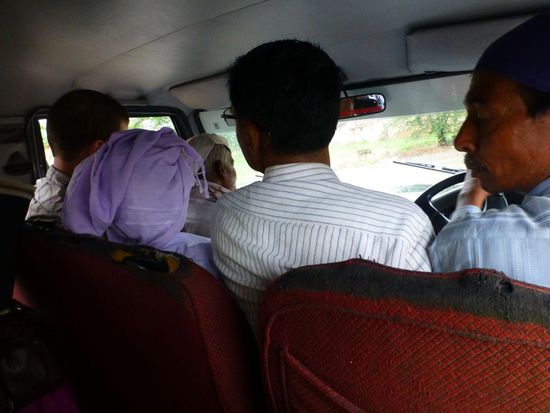 Nächsten Tag geht es dann nach Ellora, mit einem weiteren interessanten Transporttyp, dem Sammeltaxi, Die halten überall, fahren aber erst los, wenn sie voll sind. Das führt zu dem interessanten System, dass ständig Leute ein- und dann wieder aussteigen, wenn sie einen volleren Jeep sehen. Diese Jeeps haben 2 Sitzbänke und hinten 2 schmale Bänkchen im Laderaum. Wir zählen 17 Personen, allein vorne beim Fahrer sitzen neben Manuel und dem Fahrer selbst noch 3 weitere Inder, was dazu führt, dass der Fahrer so dicht an der Tür sitzt, dass er Pedale und Lenkrad nur seitlich bedienen kann. Dafür ist es recht preiswert, für 40 km zahlen wir 30 rs, also 40 ct pro Person.