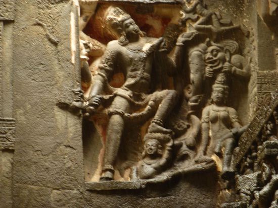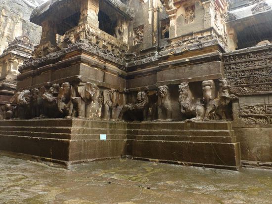 Die Ausnahme stellt natürlich der gewaltige Kailash-Tempel dar, eine sehr großer Monolith, der zwar ebenfalls aus dem Berg herausgearbeitet wurde, aber dennoch frei steht, da der Felsen ringsherum auch weggenommen wurde. Er erinnert mich an die Gebäude in Petra, er ist ein unglaublich großes filigranes Gebäude mit mehreren Seitenflügeln mit überbordenden Skulpturenreichtum, 2 großen Säulen und 2 lebensgroßen Elefanten (auch hier alles auch aus dem Vollen gearbeitet, Fehler konnte man sich hier nicht erlauben). Die untere Reihe der Friese stellen Dutzende von Elefanten dar, es ist hier wirklich der Höhepunkt. Der Tempel ist 29 m hoch und geschätzt genauso breit und vielleicht 40 m tief. Es wurde 100 Jahre daran gearbeitet und man hat 250.000 t Fels herausgeschlagen.