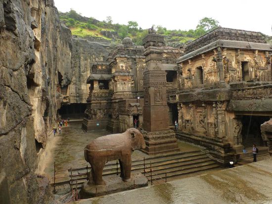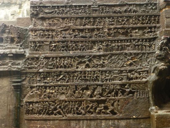 Die Höhlentempel von Ellora sollen die meistbesuchten Sehenswürdigkeiten von Maharastra sein, aber hier ist es noch viel leerer als in Ajanta, jedenfalls am Vormittag. 34 buddhistische, hinduistische und Jain Höhlen gibt es mit unglaublich bildhauerischem Reichtum. Hier begann man erst, als die Tempel von Ajanta schon verlassen waren. Über 500 Jahre wurde hier gebaut.