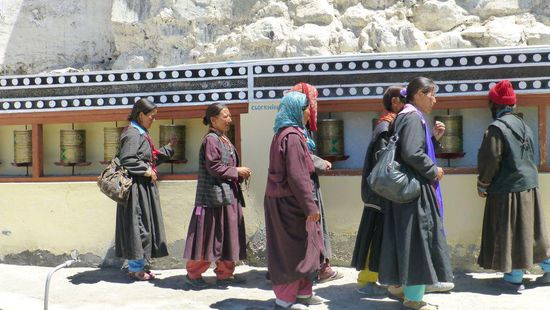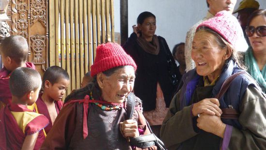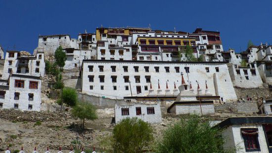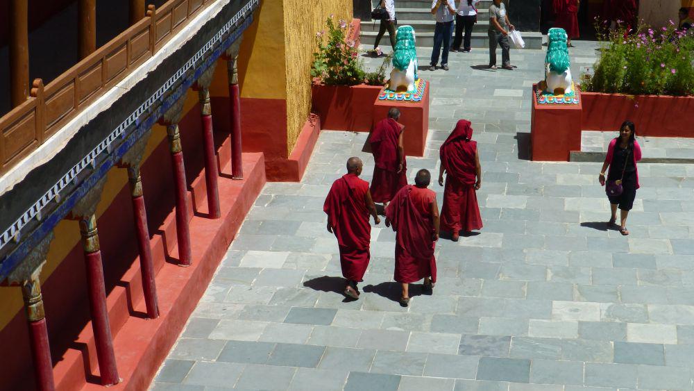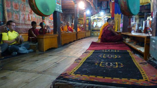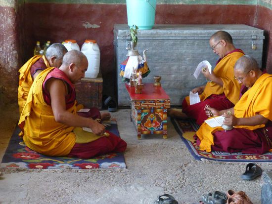Am nächsten Tag besichtigen wir noch das große Kloster Tikse (für Experten: ein Gelbmützenkloster) und dürfen dort eine lange Puja erleben, das Mittagsgebet der Mönche mit langen Rezitationen und Trommeln. Ernsthaft zum Kotzen sind aber - wie überall - einige Touristen, die sich eben nicht still in eine Ecke setzen und zuhören, sondern mit großen Kameras zwischen den betenden Mönchen umherlaufen und sie dauernd aus 50 cm Entfernung fotografieren. Ich finde es kaum erträglich. Moana geht sogar raus.