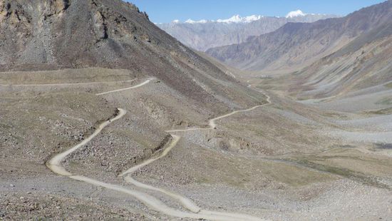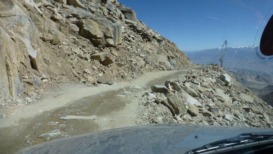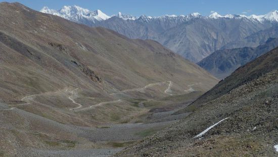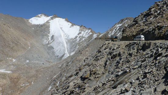 Die Straße schraubt sich wieder mal in endlosen Kehren nach oben, Leh (3350m) unter uns wird winzig klein. Nach 1 ½ Stunden ist es geschafft: Wir stehen tatsächlich auf dem höchsten befahrbaren Pass der Erde, dem Khardung-La mit 5602m! Es ist eisig kalt. Noch auf den Aussichtspunkt laufen und wir stehen auf ca. 5700m. Immerhin vertragen wir alle drei die Höhe ohne jede Probleme.