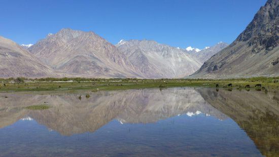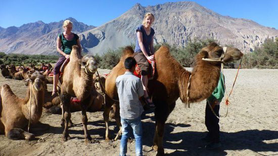 Dann geht's auf der anderen Seite wieder hinunter ins erstaunlich grüne Nubratal im Kontrast zu den majestätischen Wüstenberge ringsherum. Wasser ist hier reichlich vorhanden, daher wird fleißig bewässert, es gibt Apfelbäume, Pfirsichbäume, Reisfelder. Wir besuchen drei Dörfer, von Mönchen bewohnte Klöster, klettern auf Aussichtspunkte und reiten auf Kamelen über Sanddünen.