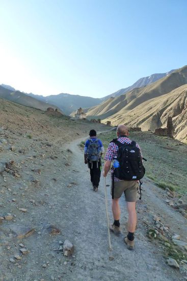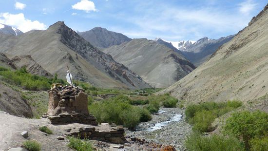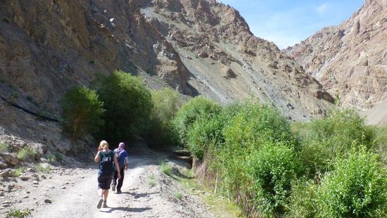 Ein zweitägiges Trekking (mehr gibt der Zeitplan nicht her) führt uns um das Stok-Massiv herum. Am ersten Tag geht es ca. 3 Stunden durch ein enger werdendes Tal steil hoch, bis wir Rumbak erreichen, ein Bergdorf mit 9 Häusern und Familien. Hier übernachten wir bei einer ladakhischen Familie, die uns auch voll verpflegt.