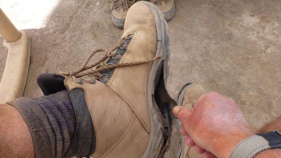 Wir hatten ja viel Glück auf der bisherigen Reise, das schöne und vor allem trockene Wetter, die Orte, die wir sehen durften, alle Verbindungen haben geklappt und es geht uns allen gut, dann der Schock: 500 m vor dem Ende des Trecks - wir sehen das Dorf Stok schon - fallen meine Wanderschuhe komplett auseinander, die Sohlen beider Schuhe fallen ab! Welch Riesenglück, nicht auszudenken, wenn das auf oder vor dem Pass passiert wäre, ich habe natürlich kein zweites Paar mit (auf dem Trek). Ich werfe sie noch in Leh weg.