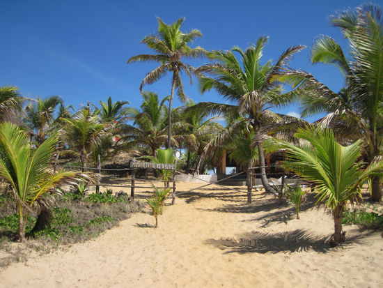 Da mein Bedarf an Busfahren für heute gedeckt ist, nehme ich ein Taxi nach Imbassai. Das Taxi ist allerdings in keinem besonders guten Zustand und der ältere Fahrer bewegt es recht vorsichtig. Wir sind langsamer als ein uns überholender Bus der Linha Verde. Ein weiterer Grund für die Taxibenutzung war allerdings der, dass es in Imbassai noch etwa 2 km von der Bushaltestelle bis zur Pousada ist. Wie sich herausstellt, liegt die Pousaga Entre as Águas an keiner Straße, sondern auf einer Sandbank zwischen Fluß und Meer. Am Hauptplatz von Imbassai steige ich aus und gehe noch etwa 100 m zu Fuß.