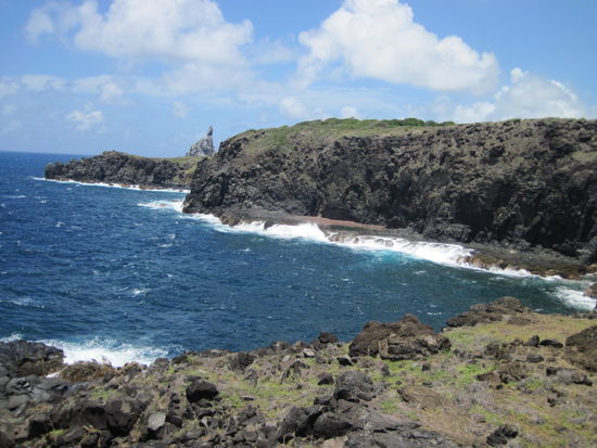 Heute möchte ich zur Praia da Atalaia. Dazu geht es zunächst nach Vila de Trita. Dort finde ich allerdings den Wegbeginn nicht und lande im Kreis wieder am "Transnoronha Highway". Na dann eben nicht, ich wollte mir sowieso den längeren Wanderweg ab dem Hafen ansehen. Der Weganfang ist gleich neben der einzigen Tankstelle der Insel. Der Weg führt anfangs oberhalb des steinigen Strandes entlang. Nach einiger Zeit ist der Weg aber offenbar durch Erosion "verschwunden". Ab hier geht es über größere und kleinere Kieselsteine weiter, das ist deutlich mühsamer und langsamer als zuvor. Als Entschädigung gibt es mehrere Tidenpools. Kurz vor der Landspitze geht es laut Karte hinauf auf den Berggrat, die Stelle ist leicht zu finden und birgt keine Schwierigkeiten. Auf der Hochebene gibt es sogar Wegweiser. Ein Aussichtspunkt erlaubt Einblick in die Höhle von Käptn Kid. Nach einiger Zeit trifft der Weg auf den zur Praia da Atalaia.