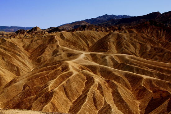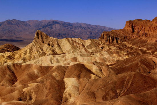 Blick vom Zabriskie Point, welcher für seine bizarren Erosionslandschaften bekannt ist. Die Gesteinsformationen sind versteinerte Sedimente (bestehend aus Salzkrusten, Geröll von den nahen Bergen und Asche des damals aktiven Black Mountain Vulkanfelds) des ehemaligen Furnace Creek Lake, der vor fünf Millionen Jahren ausgetrocknet ist.
