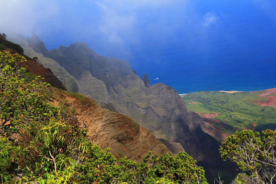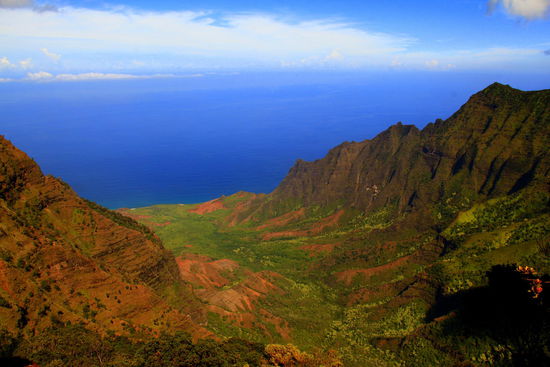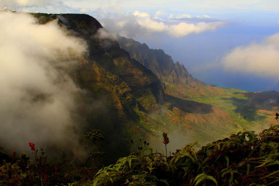 Der Blick bei Sonnenschein von hier oben aus  1256m Höhe über Meer durch das Kalalau Valley ist wohl etwas vom Schönsten, was die Natur zu bieten hat. Wirklich ein überwältigender Anblick und wir gehören zu den Glückspilzen, die das Valley heute Vormittag noch ohne Nebel sehen konnten