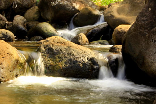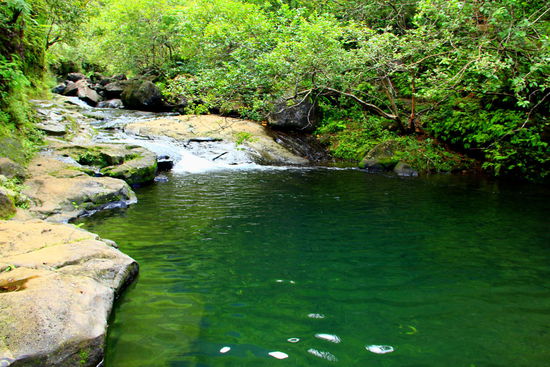 Nach dem Mittagsrast und einem "Retobad" im Bach gestaltet sich der weitere Weg  mit den zahlreichen Guave - Früchten am Boden etwas kniffliger: er wird eng und gibt teilweise gerade knapp Platz für 1 Pers., durch den Schlamm, über Steine durch Bäche balancieren (etwa 5x!!), zwischendurch klettern (ohne Arme& Hände einzusetzen geht`s nicht!) etc.