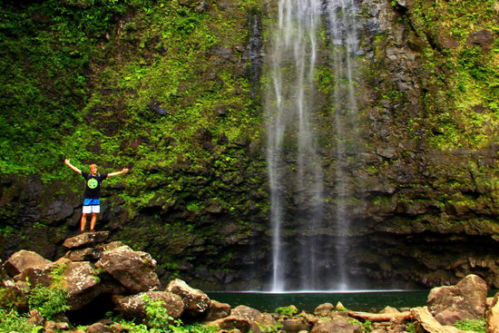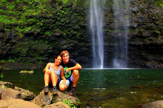 Keuchend kommen wir bei den etwa 150m hohen Hanakapiai Falls mit dem grossen Pool darunter an. Wow!!! Und siehe da - wir haben ihn ganz für uns alleine!!  Nach einem kurzen Fotoshooting springen wir ins kühle Nass und genießen gemeinsam den Naturpool, wunderbaaar