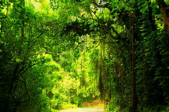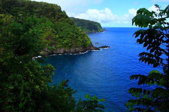 Die Kurven von gestern sind nichts gegen die von heute, denn wir fahren die "Road nach Hana". Dies sei die schönste Straße von ganz Hawaii. Tatsächlich führt sie toll durch den Regenwald und immer wieder bietet sich der Blick aufs Meer.