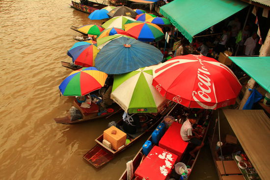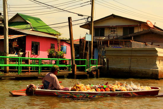 Während unseres letzten Thailandurlaubs war die Zeit zu knapp, um einer der zahlreichen "floating markets" zu besuchen - so wollen wir dies nun heute nachholen. Gestern haben wir einen Taxifahrer gefunden, bei welchem die Preise "gäbig" (hmm, wie sagt man das auch Schriftdeutsch?!) nach runter verhandelbar sind und er bot uns an, uns für weniger als den halben Preis der Hoteltour zu einem floating market zu fahren. Extra im Internet erkundigt, wollten wir eigentlich an einen wenig touristischen Markt, doch der Taxifahrer schien enttäuscht (obwohl die Märkte distanzmässig gesehen nicht weit auseinander liegen) und versucht alles, um uns an den touristischen Markt zu fahren. Er meint, der andere wäre schmutzig und hier seien viel mehr Touristen (wertete dies pos. ).