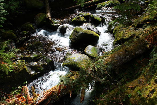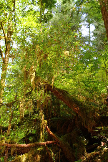 Wir entschließen uns, ein bisschen am See entlang zu wandern. Laut Übersichtskarte kämen wir an einer Hauptstraße raus, wo es auch sowas wie einen Ortskern geben sollte. Wir konnten im Safeway ja nicht einkaufen, aber von der Straße aus hatten wir schon gesehen, dass es da eine Tankstelle gibt und auch ein kleines Geschäft. Los geht es also und das Laufen tut richtig gut nach den langen Stunden im Auto. Schnell sind wir am Endpunkt dieses kleinen Trails und schauen auf eine weitere Übersichtskarte, wie wir jetzt am besten zu dem kleinen Laden und dann wieder zurück kommen. Wir einigen uns auf einen Weg und gehen los. Überall tauchen riesige Küstenmammutbäume auf, immer wieder sieht man einen Wasserfall und der Pfad schlängelt sich wunderschön durch den Regenwald. Dieser Pfad heißt wohl nicht umsonst Rainforest Trail.