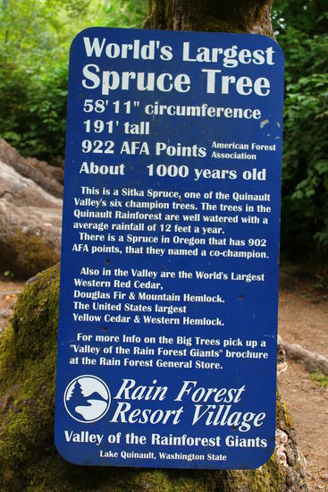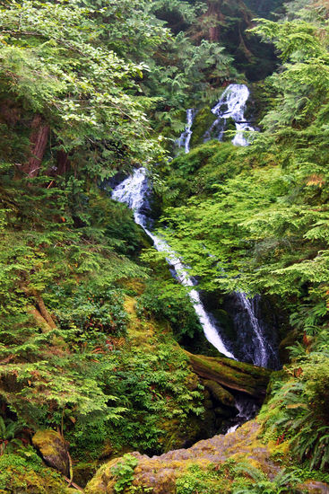 Nach dem Frühstück geht es wieder früh los. Zuerst wollen wir uns noch zwei Highlights der Gegend um Quinault ansehen: einen großen Wasserfall und die weltgrößte Sitkafichte. Nachdem wir ein wenig auf unbefestigten Straßen herumgeirrt sind, finden wir auch zunächst den Wasserfall, schön!