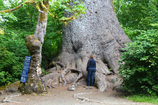 Und dann stehen wir vor dieser riesigen Sitka-Fichte. Für mich als Försterin wirklich beeindruckend, solche Ausmaße schaffen diese Bäume in Deutschland nicht. Aber hier ist schließlich auch ihre ursprüngliche Heimat und sie haben die besten Wuchsbedingungen.