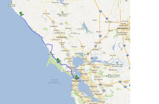 Erst einmal ein Stück durch die Stadt, dann über die Golden Gate Bridge und schließlich auf dem Highway 1 immer Richtung Norden, yeehaa!