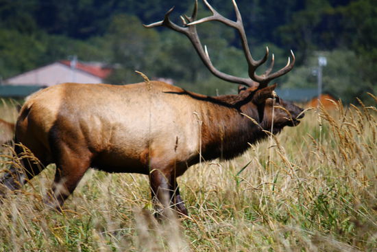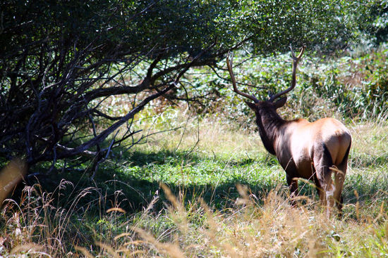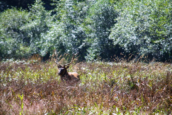 Ausgerüstet mit einer Schüssel zupfen wir die leckeren Beeren von den Sträuchern und gehen auf diese Weise wieder ein Stück Richtigun Trillium Falls Trail, auf dem wir ja gerade waren. Jetzt werden die Geräusche immer lauter und uns wird etwas komisch. L. schleicht sich immer weiter ins Gebüsch und flüstert plötzlich aufgeregt "Hier sind Elks, direkt hinter der Hecke!" Und ja, jetzt seh ich sie auch. Wahnsinn, so dicht dran, die haben uns gar nicht bemerkt. Der Wind steht auch so, dass sie uns nicht in die Nase kriegen, außerdem schleichen und flüstern wir nur noch. "Sind die aggressiv?" fragt L. mich. Tja, als Forstingenieurin sollte ich das wissen, aber ich kenne mich nur mit unserem heimischen Wild aus, da gibt es keine Wapitis ... Aber ich sage einfach mal Nein, sind sie nicht, wieso auch Ängste schüren