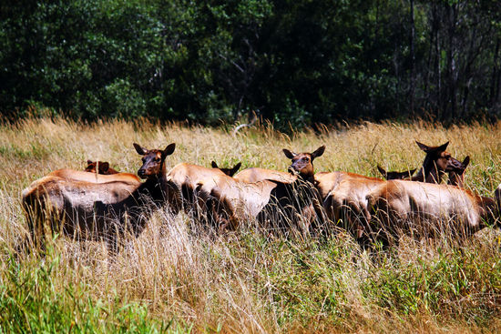 Wie schön! Nun habe ich aber genug Fotos gemacht, weiter geht's. Aber nicht sehr weit, denn nun kommen wir an dem Touristenauflauf vorbei, den wir ja schon von weitem gesehen hatten. Hier sind noch viel mehr Elks, Ein großer Hirsch mit einem Rudel weiblicher Tiere. Ok, also nochmal anhalten und viele weitere Fotos schießen.