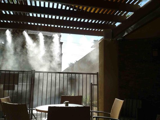 Frühstück mit Freiluftklimaanlage - der weiße Dunst sind verdampfende Wassernebel zur Kühlung der Umgebung