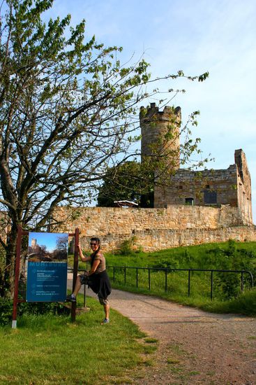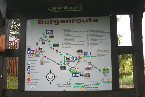 Nun ging es los. Wir begannen mit dem Aufstieg zur Ruine Mühlburg, der ältesten Anlage der Drei Gleichen. Am Fuß des Bergleins fanden wir noch eine schöne Wandertafel und versorgten uns mit Kartenmaterial.