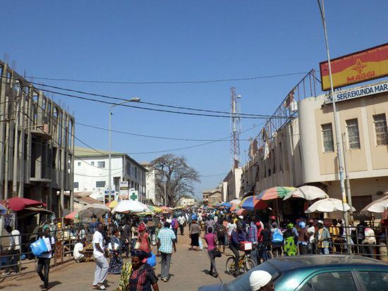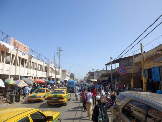 Nach dem heiligen Krokodilbecken sind wir mit dem Taxi über die staubigen Straßen von Gambia in Richtung Serekunda Market.