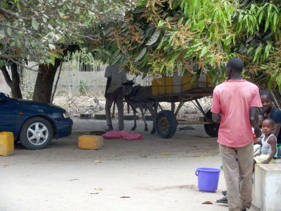 Das Wasser zum Duschen wird aus einem Brunnen geholt. Das Trinkwasser bringt ein Transporteur von der öffentlichen Zapfstelle mitten im Dorf gegen ein Endgeld.
