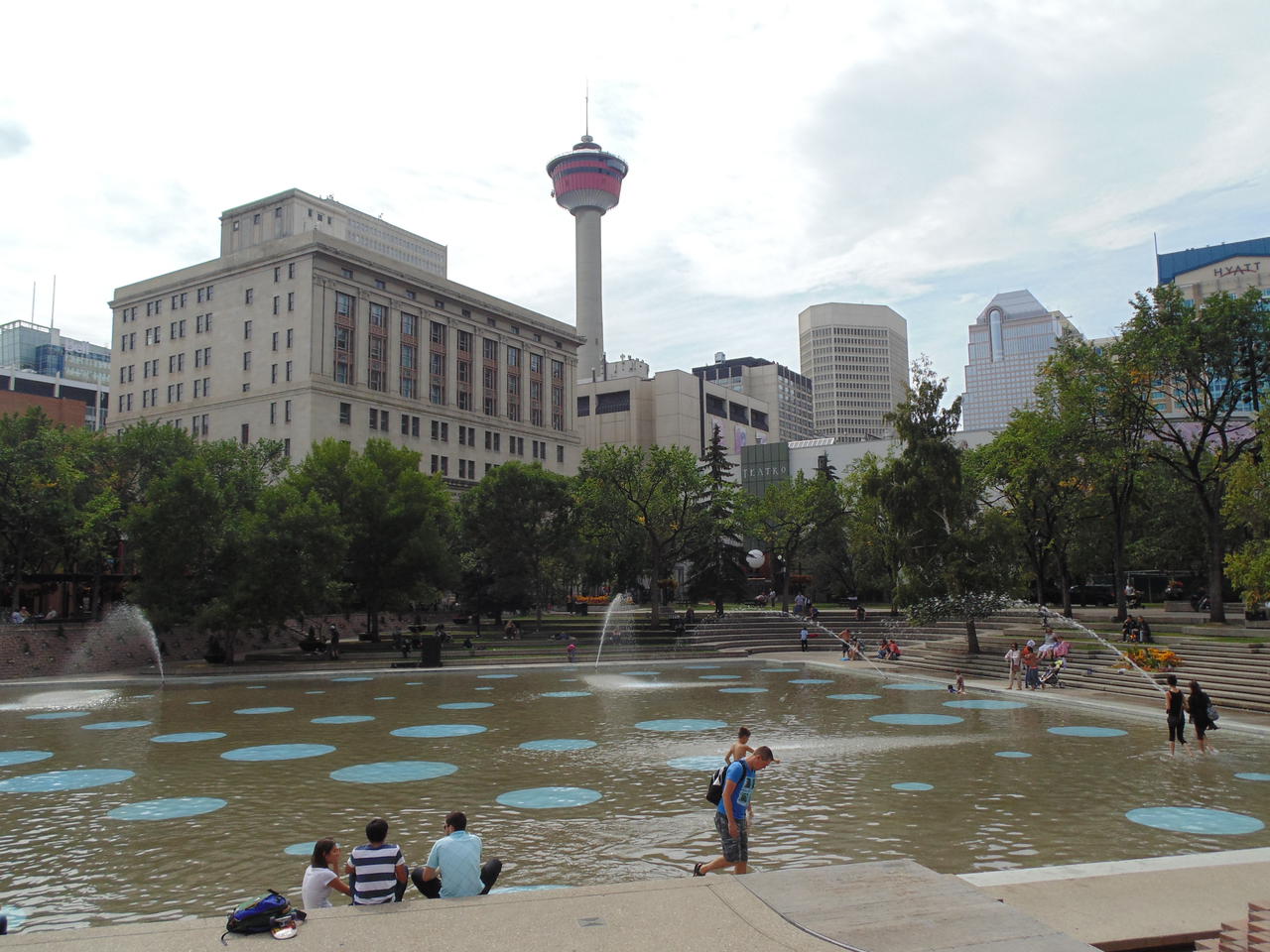 Obwohl unsere innere Uhr inzwischen sagt, dass es Schlafenszeit ist, weigern wir uns strikt gegen diese Anweisung und begeben uns stattdessen auf eine erste Erkundungstour durch die 1,07 Mio. Einwohner Stadt. Mit der Straßenbahn geht es zum wenige Haltestellen entfernten Olympic Plaza, wo sich das wunderschöne alte, aus Sandstein gebaute, sowie das moderne, neue Rathaus (1986) befinden. Auf dem extra für die Olympischen Spiele angelegten Platz, der heute das kulturelle Herz der Stadt darstellt, wurden im Winter 1988 allabendlich die Medaillen verliehen. Heutzutage finden hier im Sommer Open-Air-Veranstaltungen statt. Hoch über dem Platz ragt der 191 m hohe Calgary Tower auf - das Wahrzeichen der Stadt und damaliger Träger der olympischen Fackel. Wir spazieren gemütlich durch die Fußgängerpassage Stephen Avenue, die gesäumt ist von bunten, liebevoll angelegten Blumenarrangements, kleinen Cafés und hübschen Geschäften. Zum Abschluss unserer Spaziertour (die Augen und Glieder kämpfen konstant tapfer gegen die Müdigkeit) werfen wir noch einen Blick auf die Devonian Gardens, einer künstlichen tropischen Gartenanlage mit Teichen und Palmen in der obersten Etage eines Einkaufszentrums.