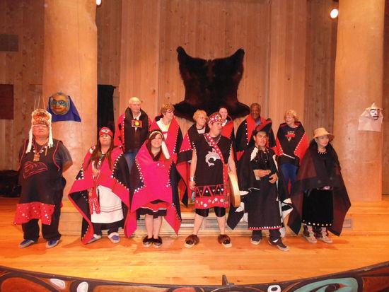 Obwohl der Tag sich bis hierher bereits gelohnt hat, freuen wir uns trotzdem auf unseren gemeinsamen Ausflug: mit einer Waldbahn geht es auf Erkundungsfahrt durch den Regenwald und an den Strand. Unser Tlingit-Indianer "Cookie" erzählt uns Wissenswertes über den Wald, dessen heimische Pflanzen und Tiere und deren Bedeutung bzw. Verwendung für die Indianer. Im Anschluss besuchen wir das komplett aus Holz gefertigte Theater der Tlingit und lehnen uns bei einer tänzerischen und erzählerischen Darbietung zurück. Die Entstehungsgeschichte der Welt aus Sicht der Tlingit wird uns anschaulich dargeboten und wir erfreuen uns an den kunstvoll verarbeiteten traditionellen Kleidern und an dem von einer Trommel begleiteten Tanz und Gesang. Der Rabe brachte den Menschen einst den Mond, die Sterne und das Tageslicht und ist damit für die Tlingit sinnbildlich der Schöpfer der Welt. Weil aber doch nicht alles so eindeutig zu verstehen war, fasst uns Elisa am Abend die Vorführung noch einmal zusammen und erklärt die dargebotene Geschichte ausführlich. Nach diesem Tag sind wir nun nahezu Experten was die Kultur und den Glauben der Tlingit-Indianer betrifft .