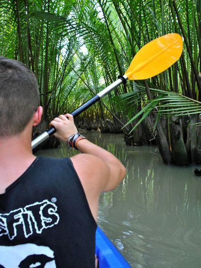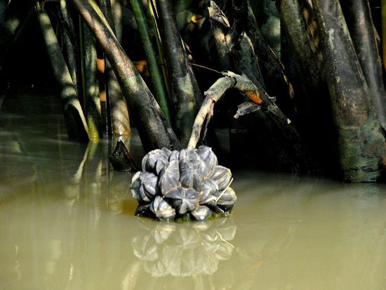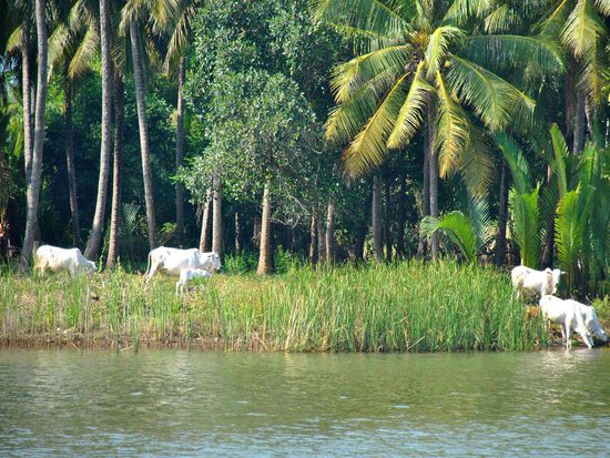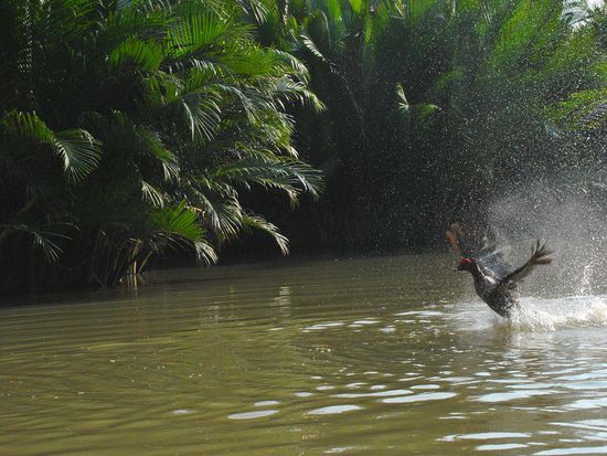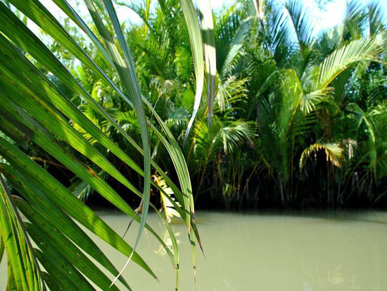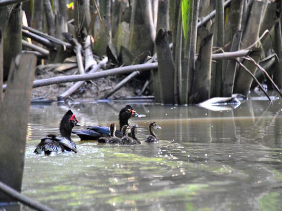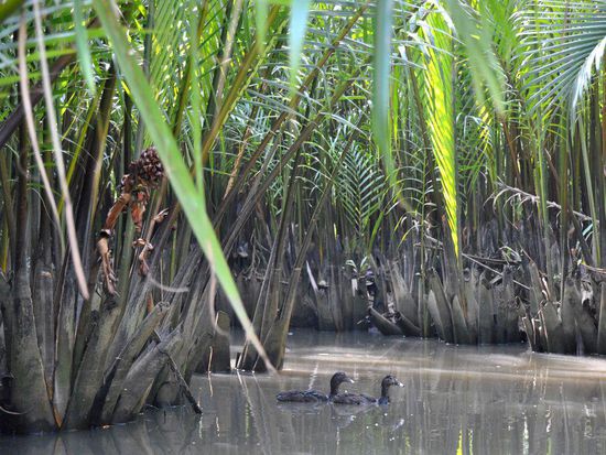Riesige Palmen rechts und links - ab und zu Vogel-(Enten??)familien. Ansonsten begegnet uns kein Lebewesen. Zum Glück, den so rein vom Bild her hätte auch der Rücken eines Krokodils gepasst.