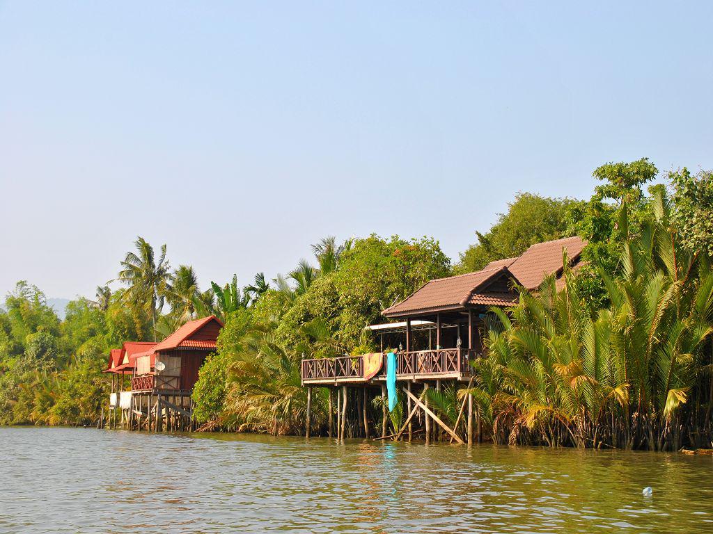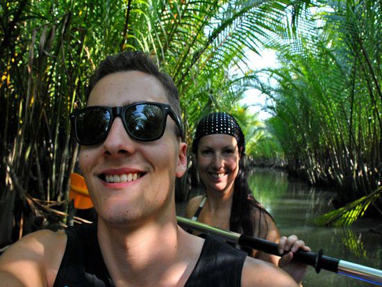 Ein lustiges Erlebnis: auf einmal - als wir bereits mitten zwischen den Palmen im kleinen Flusslauf steckten - geht mein Handy, meldet sich in dem wasserfesten Sack! Cambodia, Kingdom of Wonder, mit Internetverbindung so gut, dass eine Nachricht den Weg von den Schweizer Bergen zum kambodschanischen Flussnebenarm findet.