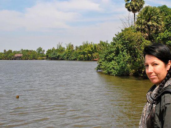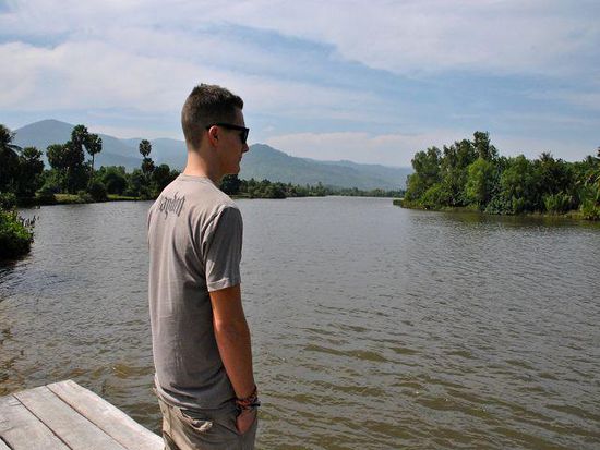 Dann entdecken wir einen Rastplatz am Ufer des Flusses. Vorsichtig tasten wir uns Schritt für Schritt über einen Steg, dessen Bretter aussehen wie in den Filmen, wo dann die Protagonisten auf Brücken einbrechen und runterstürzen. Aber wie so oft: Steg vorhanden, Steg funktioniert und wir landen auf der Flussterasse. Es geht ein leichter Wind, das andere Flussufer ist gesäumt von riesenhaften Palmblättern. Ein paar Meter von uns entfernt geht ein Bauer mit seiner Kuh ins Wasser - die sollte wohl gewaschen werden. Alles ist ruhig, friedlich und wir genießen die Atmosphäre nach den lauten und hektischen Tagen in Phnom Penh.