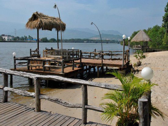 die ca. 4 km bis Kampot sind zwar interessant zu Fuß, aber auch so anstrengend, dass wir gerne eine Rast von mehreren Stunden am Flußufer einlegen, als wir ankommen. Natural Bungalows - kann man auch als Unterkunft buchen. Unsere gefällt uns besser, aber die Terrassen, auf den man sich aufhalten kann - direkt am Fluß - sind genial. Essen, trinken, Fotos bearbeiten, Reisebericht schreiben (jajaja... Kamboscha ist Deutschland WEIT voraus, was free wifi betrifft!!!! ) alles im Schatten mit leichtem Wind und dem beruhigen Plätschern des Wassers. Herrlich!