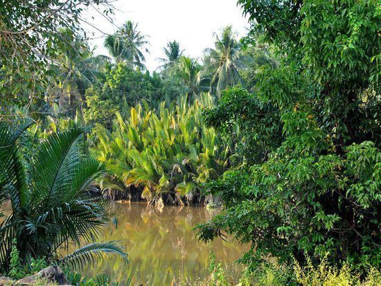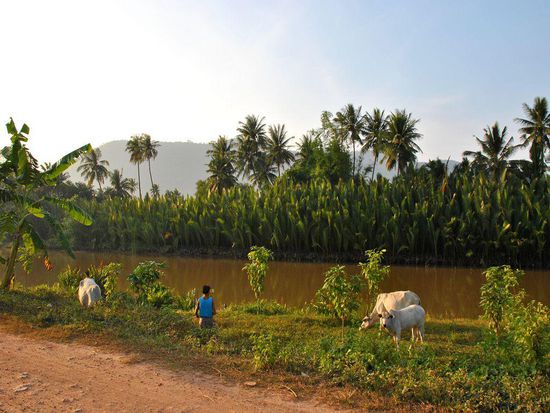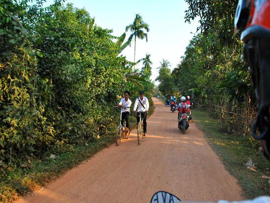 Dann geht es los. Ins Landesinnere auf einer kleineren Straße Richtung Teuk Chhou. Da sollen Badestellen sein. Der Verkehr hier ist angenehm, man kommt auch als "barrang" zurecht. Ein gemütliches Tempo erlaubt auch Blicke auf Land und Leute rechts und links des Weges. Und nachdem ich mich an Moped und meinen Fahrer gewöhnt habe, werden auch ganz mutig ein paar kurze Fahrtvideos mit dem Handy gemacht.