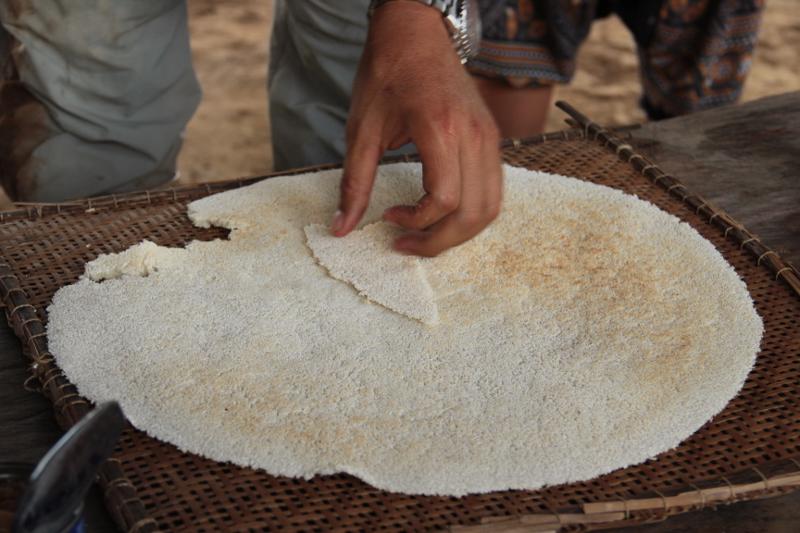 Dann drückt sie nach und nach das Mehl der Frucht in eine Pfanne und backt es ganz zart über dem Feuer. Es entstehtein gutes Fladenbrot, das uns Hyro mit Thunfisch und der oben besagten Chillipaste serviert. Es schmeckt köstlich.