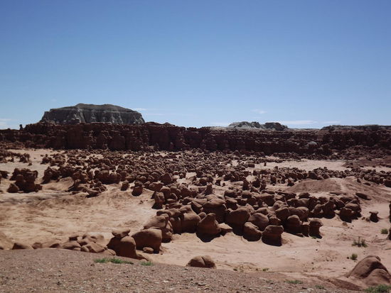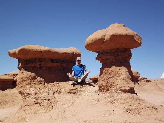 Da die Zeit doch zu schnell vergeht, haben wir leider keine größeren Wanderungen machen können. Als nächste Station führte uns unser Weg nach Goblin Valley. Es handelt sich hierbei um drei kleine Täler, in denen jede Menge pilz- und gnomartige Steinskulpturen stehen. Wie immer mussten wir am Eingang Eintritt bezahlen (diesmal nur 8 $). Vom Parkplatz aus hatten wir schon mal einen tollen Überblick über eins der Täler. Nach einigen Fotos haben wir den Weg nach unten gesucht und uns auf Erkundungstour gemacht. Da es dort keinen ausgewiesenen Wanderweg durch die Goblins gibt sind wir einfach auf gut Glück durch das Tal gewandert und haben uns die lustigen Gesellen angeschaut. Nach unzähligen Fotos und viel Kletterei sind wir wieder zum Auto zurück. Wir hatten ja noch ca. 1,5 Std. fahrt nach Moab vor uns.