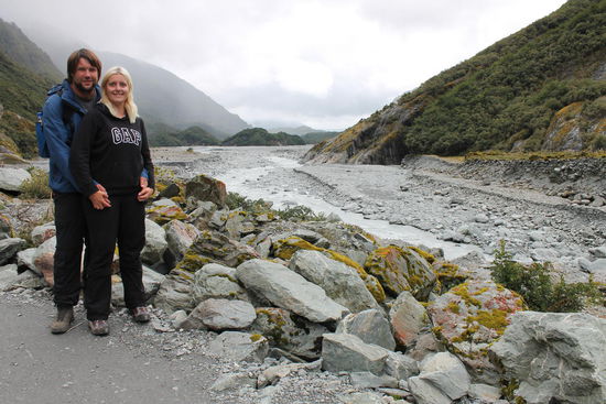 Unser neues Ziel sollte der Fox Gletscher bzw. der wenig später folgende Franz Josef Gletscher sein. Geplant war eigentlich, schon am Fox Gletscher die Nacht zu verbringen, aber wie das Wetter an der Westküste so ist, es schüttete ohne Ende. Dementsprechend fuhren wir noch ein wenig weiter und verbrachten die Nacht am Donnerstag, 13.02.2014, in der Nähe des Franz Josef Gletscher auf einem einfachen Campground. Am folgenden Tag, 14.02.2014, fuhren wir vom Campground zum Gebiet um den Franz Josef Gletscher. Nach einer halben Stunde zu Fuß vom Parkplatz bis zur letzten Absperrung, bevor es dann endgültig verboten ist, weiterzulaufen, hatten wir kurzzeitig etwas Sonnenschein und somit einigermaßen gute Sicht auf den Gletscher. Es war schon verrückt. An der Absperrung, an der wir standen, war 2008 noch Gletscher. Und jetzt waren es bis zum Gletscher noch gut 400 - 500 Meter. Klimawandel lässt auch hier massiv grüßen. Nach dem wir wieder viele Bilder vom Gletscher gemacht hatten, begaben wir uns um die Mittagszeit auf den Weg gen Norden.