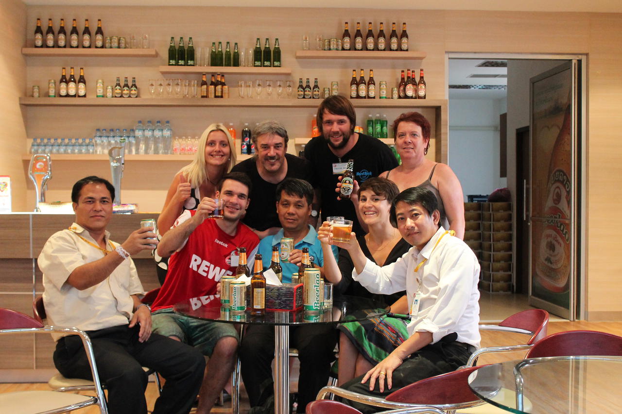 Für Donnerstag, 10.04.2014, haben wir uns wieder einen persönlichen Fahrer gebucht, der uns zu den Highlights gefahren hat, die wir besuchen wollten. Die erste Anlaufstätte für uns war der Buddha-Park, in der näheren Umgebung von Vientiane. Hier kann man wirklich jede Größe eines Buddhas bewundern. Wir hielten uns dort ungefähr 2 Stunden auf und fuhren dann weiter zum nächsten Ziel, der Freundschaftsbrücke, die Laos mit Thailand verbindet. Es gibt mittlerweile über das ganze Land verteilt, 5 solcher Brücken. Das eigentliche Highlight an diesem Tag sollte aber noch kommen. Wir ließen uns von unserem Guide zur BeerLao-Brauerei fahren, die die einzige im ganzen Land ist. Es gibt noch eine kleine Zweigstelle in Pakse, aber das meiste Bier wird in der Hauptstadt fürs ganze Land hergestellt. Jedenfalls hatten wir geplant, eine Brauereibesichtigung zu unternehmen. Allerdings gab es diese an dem Tag nicht und so sind wir kurz entschlossen, in die Brauereibar eingerückt, um einen Haustrunk zu uns zu nehmen. Dabei lernten wir Katja, eine Leipzigerin, kennen, die in der Brauerei als Englischlehrerin angestellt ist. Mit ihr und auch einigen Mitarbeitern unterhielten wir uns angeregt. Es war in jedem Fall ein lustiger Nachmittag. Am späten Nachmittag hat uns unser Fahrer dann zurück ins Hotel gefahren, wo die nächste Überraschung auf uns wartete. Der Eigentümer vom Hotel feierte seinen Geburtstag und wir waren plötzlich mitten auf der Party.