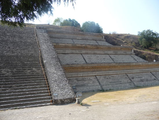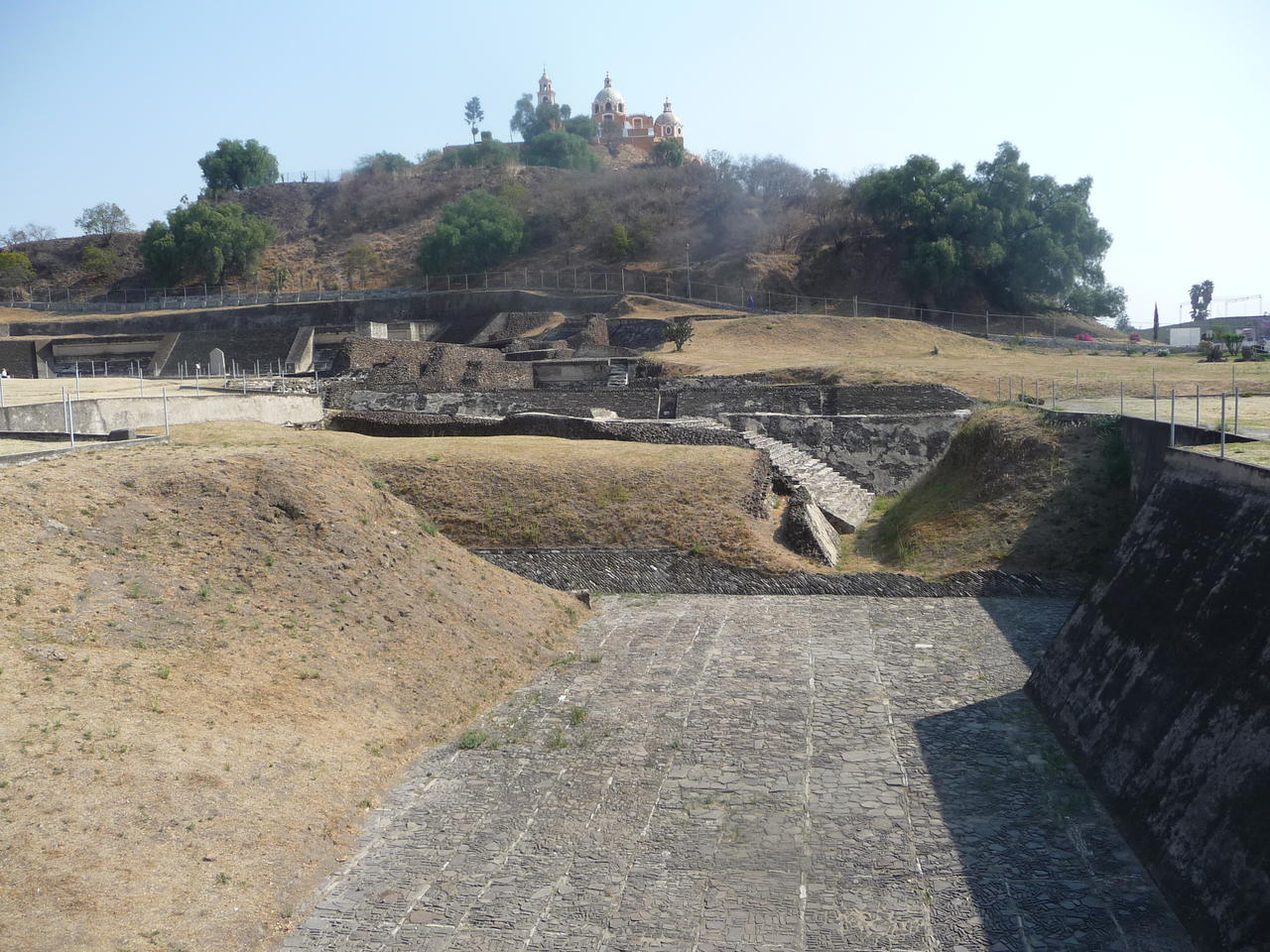Nach einem guten Frühstück in meinem Hotel in Puebla geht es in den 15 km westlich liegenden Vorort Cholula. Ich bin nur hier um Ruinenstätte rund um die Cholula Pyramide etwas genauer unter die Augen zu nehmen da ich bei meinem letzten Besuch 2009 dazu keine Gelegenheit hatte. Cholula ist einer der der ältesten Städte Amerikas und seit der Teotihuacan Zeit 200 vor Chr. bis heute ohne Unterbrechungen besiedelt. Im Laufe der Zeit herrschten verschiedene Völker in Cholula u.a. Tolteken und Olmeken. Während seiner Durchreise richtete Hernan Cortes mit Hilfe Tlaxcaltekischen Gruppen ein Blutbad an bei dem über 5000 Menschen brutal umgebracht wurden. Die Cholula Pyramide wurde mehrmals überbaut und war Quetzalcoatl gewidmet. Bei der Ankunft der Spanier 1519 war die Pyramide bereits überwachsen so das einfach oben drauf eine Kirche errichtet wurde. Mit ca. 420 m Länge und mehr als 60 m Höhe ist die Cholula Pyramide bis heute die an Volumen größte der Welt. Mit Hilfe von ca. 8 km langen unterirdischen Gängen die durch das innere der Pyramide führen konnte man die architektonische Geschichte entschlüsseln und feststellen das es 4 Konstruktionen gab die von 200 vor Chr. bis 800 nach Chr. entstanden sind . Die erste Konstruktion hatte dabei große Ähnlichkeiten mit der Sonnenpyramide von Teotihuacan. Die letzte Konstruktion und Überbauung die um das Jahr 800 nach Chr. erfolgte bildet die gigantische Pyramide deren Größe man heute noch bewundern kann.