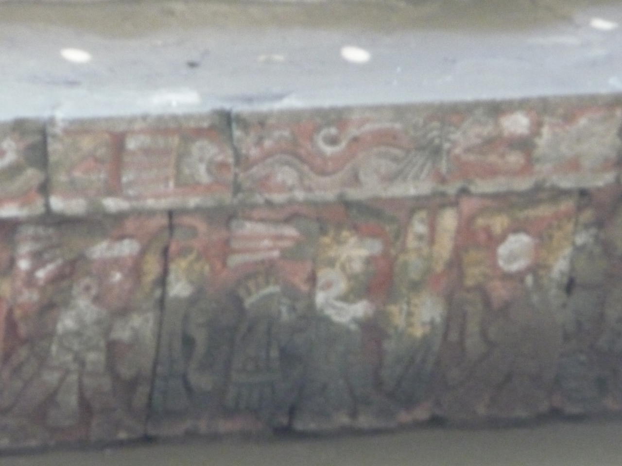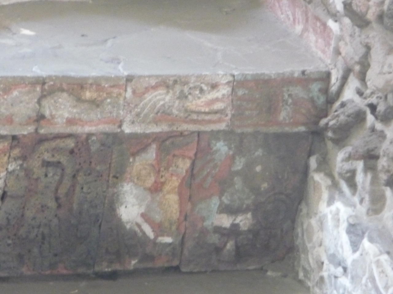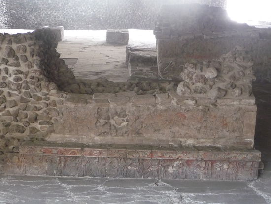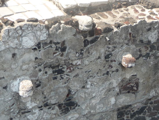 Der erhaltene Tzompantil Sockel des Templo Mayor mit Abbildungen von verzierten Schädeln. Direkt darüber wurden die Schädel der Opfer zur Schau gestellt.