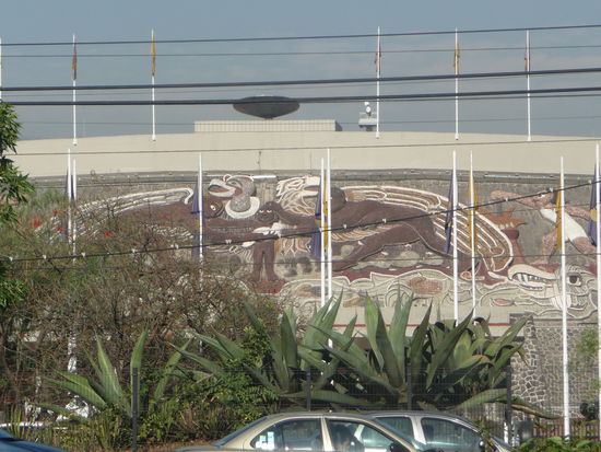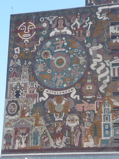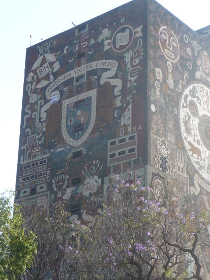 Am heutigen Tag nahm ich einen zweiten Anlauf um die Universität von Mexiko City zu besuchen. 2009 habe ich diese leider nicht sofort gefunden und bin aus Zeitgründen wieder zurück zum Hotel gefahren. Die Metro Linie 3 fährt zwar bis zur Endhaltestelle Universität aber diese liegt nicht direkt am Metro Bahnhof sondern man muß erst mit einen der Shuttle Busse mehrere Kilometer fahren bis man auch am eigentlichen Ziel ist. Da es aber 2 verschiedene Bus Terminals gibt die ca. 1 Km auseinander liegen mußte ich auch diesmal etwas suchen um den richtigen Bus zu bekommen. Der Fahrer war sehr freundlich und sagte mir das die Shuttle Busse zur UNAM kostenlos sind. Nach ca. 15 Minuten erreichte ich eine der ältesten und größten Universitäten der Welt. Der riesige Campus mit mehr als 80 Gebäuden wurde in den 50siger Jahren des 20. Jh. erbaut und sind ein Paradebeispiel mexikanischer Architektur. Gegründet wurde die UNAM aber schon mitte des 16. Jh. Weltweit bekannt ist sicherlich die fensterlose Biblioteca Central deren Außenseite komplett mit einen wunderschönen Bildmosaik verblendet ist. Seit 2007 gehört der Campus UNAM zum UNESCO WELTKULTURERBE !!