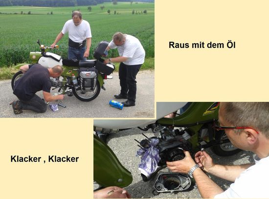 Ich rief also zu Hause an und meine Frau schmunzelte und fragte ob sie den Ersatzmotor aus dem Keller vorbeibringen sollte. "Stoney sollen wir meinen Ersatzmotor einbauen der läuft prima." "Nee das muss doch laufen" kam von Stoney.