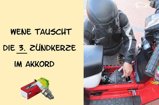 Wene: "drecks Zündkerzen !!!" Er schimpfte und wechselte die Zünkerze im Akkord. Gefühlt unter 2 Minuten was für seine Routine bei dieser Tour sprach.