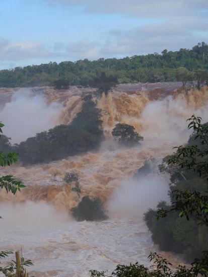 Der tagelange Regen in den Regionen Paraná & Curitiba hat für mehr als randvolle Flüsse gesorgt und so kam es, dass wir pünktlich zum Hochwasser im Nationalpark Foz do Iguaçu standen. Die argentinische Seite war komplett geschlossen; die Brasilianische war teilweise geöffnet. Seit 1992 hat es so eine Situation nicht mehr gegeben. Folglich konnte auch niemand abschätzen, wann sich die Situation wieder normalisiert ... noch dazu war die Wetterprognose alles andere als trocken! Da wir nun extra den kleinen Schlenker von La Paz (Bolivien) hierher gemacht hatten und der Tag ohne Regen angekündigt war, entschieden wir uns für eine Besichtigung. Es waren nur die oberen Wege geöffnet. Die Aussichtspunkte direkt an den Wasserfällen waren fast vollständig überspült. Ein lautes Tosen und einfach unglaublich viel Wasser .. zwischendurch ein paar Bäume, die mit letzter Kraft den Wassermassen trotzten. Wir mussten an verschiedenen Aussichtpunkten immer wieder Postkarten anschauen, um den Normalzustand vor Augen zu haben. Ein eindrückliches Erlebnis, diese geballte Kraft der Natur so "losgelassen" zu erleben.