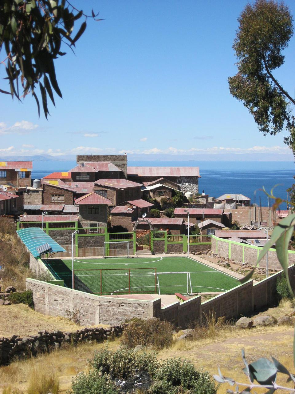 Auch wenn das Inselzentrum eher antiquiert wirkt, ziert ein moderner grasgrüner Kunstrasenplatz das Ensemble.