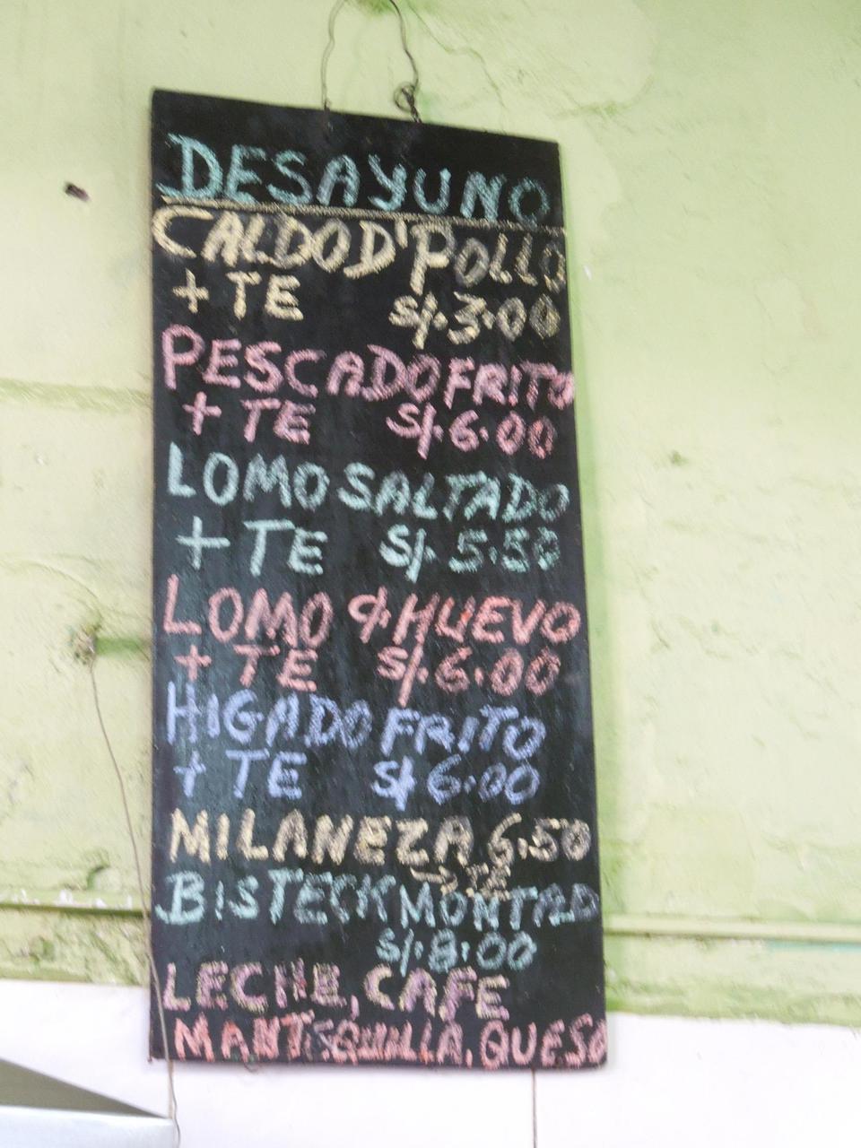 Frühstück: Hühnersuppe & Tee; frittierter Fisch & Tee; sautierte Lende & Tee - auch mit Ei zu haben; frittierte Leber ...