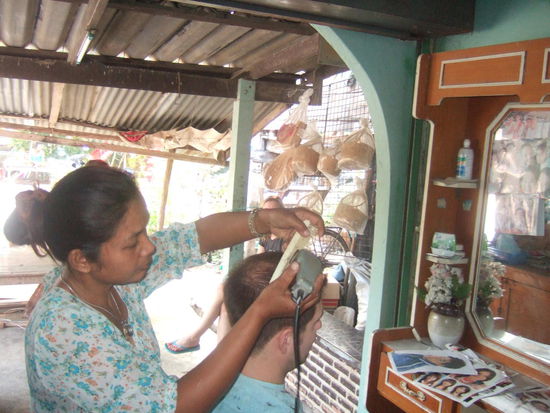 Am Nachmittag sind wir mit den Rädern durch das Dorf gefahren und haben den Friseur gesucht. Willi brauchte dringend eine neue Frisur. Die gab es dann auch für 30 Bath (0,76 Euro) und genauso gut wie bei uns daheim