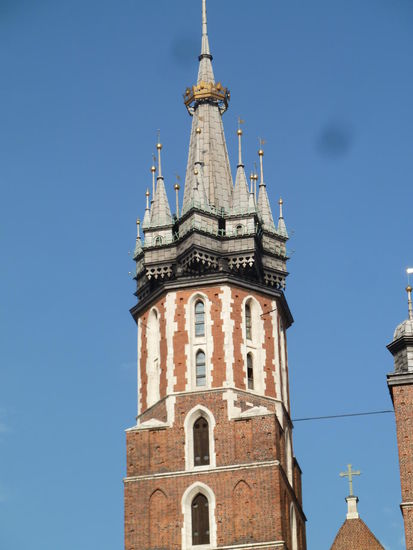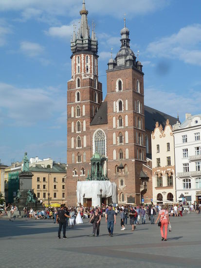 Doch dann sind wir am Rynek Glowny - dem berühmten Marktplatz von Krakau mit dem Wahrzeichen der Stadt - der Marienkirche. Sie wurde 1287 -1320 auf den Fundamenten einer romanischen Kirche errichtet. Die besonderheit dieser Basilika sind die beiden unterschiedlich hohen und unterschiedlich gestalteten Türme.