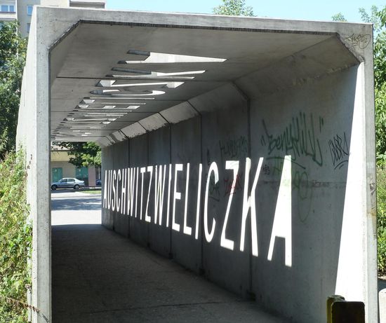 Ein kleines Stück Richtung Osten und man läuft durch einen 'Betontunnel' dessen Dach so ausgeschnitten ist, dass auf die Seitenwand der Name Auschwitz Wieliczka durch die Sonne projeziert wird, und so bereits auf dem Weg einstimmt auf die Besichtigung von Schindlers Fabrik .